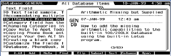 Many other database programs have the ability to generate printed, columnar reports, complete with subtotals and grand total. The Database engine in the HP Palmtop does not have such a function. However, several users have found that you use the Smart Clip function to produce the raw material for a columnar report. The Smart Clip function will let you set the spacing for each output field. You can also specify whether you want data to be right or left justified or centered in a printed column. Granted, getting the Smart Clip to produce a readable report using the built in spacing commands takes some trial and error.