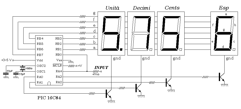 a single PIC 16C84 and 4 displays to measure frequencies in the