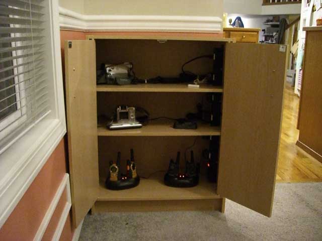- A cabinet. Ideally, it should match your decor somewhat, have doors and adjustable shelves, and enough room for all your gadgets that you want to hide away while charging. This is the one I got from Fred Meyer.