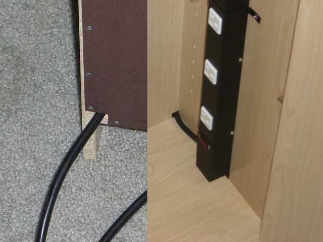 - Before you nail on the backing for your cabinet, figure out where the power strip cord will be exiting the back of the cabinet, and take a notch out of the backing piece. For my cabinet, it was just a heavy piece of cardboard with wood print on one side. All I needed was a pair of heavy scissors to cut a piece out of the bottom corner nearest the power strip cord.