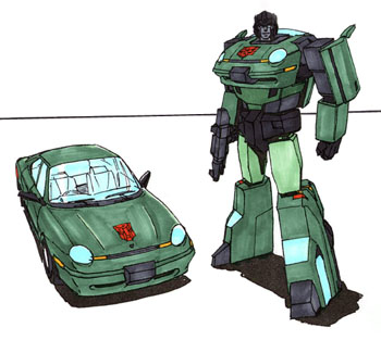 Often known as "hobbybot", Flux is always doing something different. When there are no battles to fight or duties to perform, he is in his quarters learning a new hobby of some sort. Most of the other bots fear his hobby phases since they know they will surely end up with some horrible trinket as a result. During his woodworking phase, there was not a bot on base without a new piece of furniture, whether they needed it or not. To compliment his ever changing interests, Flux has the rare power of shape-shifting. He can alter his shape to anything he wants. In a mischievous mood, he has been known to take female form and trick 'Cons into giving him valuable information. One drawback to this ability is that his molecular structure and character attributes remain unchanged. If he were to pretend to be a pillow, one would have a hard time laying on him comfortably. As well as strength and speed, his voice also remains unchanged, so he has a pretty hard time playing the old female trick on the bots. Most of the time, he remains in one of his two given shapes: a Dodge Neon automobile and corresponding robot mode.