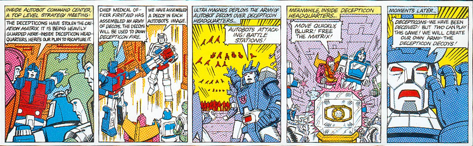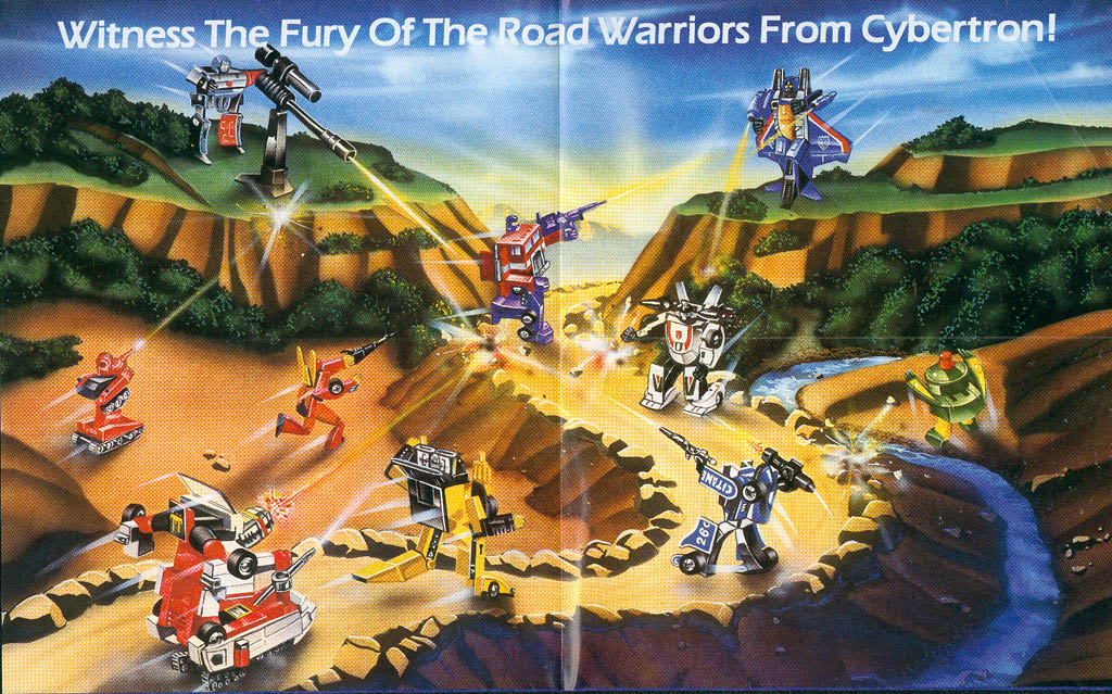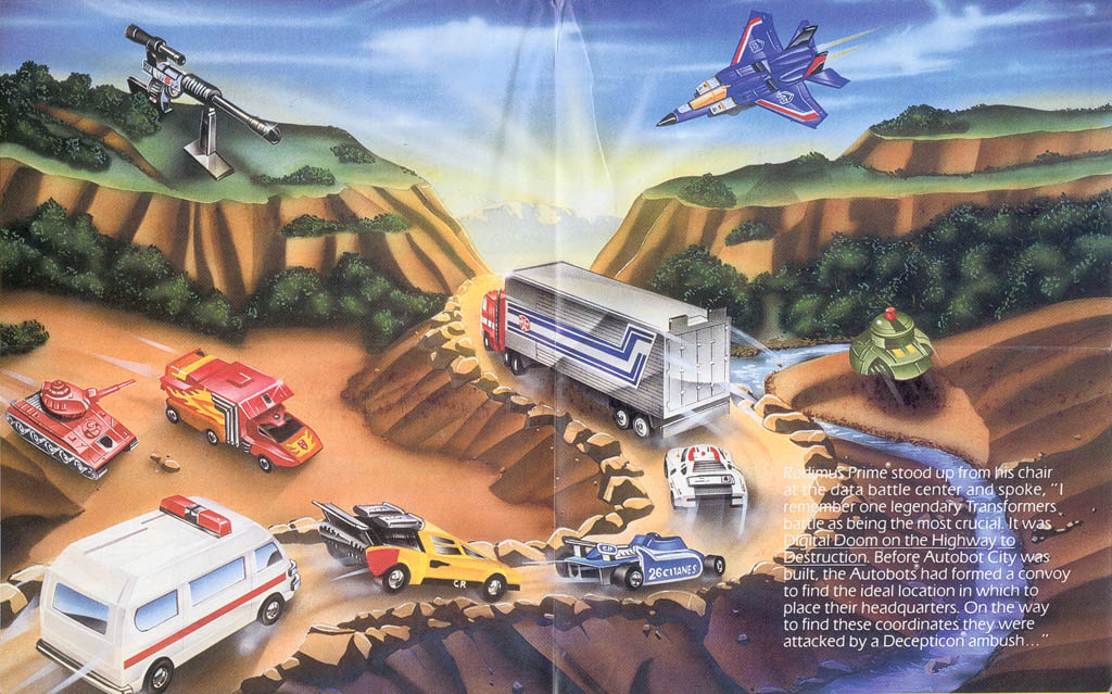 Box Back Battle ScenesThese are scans of the cool battle scenes that appeared on the back of toy boxes through most of the original TF series. Although the US toys stopped including these scenes with the start of Generation 2, Japan continued the tradition. I wish I had more than the one from Japan, though. Also, these are not ALL the scenes ever produced, just a few of them. Most are presented at 1024x764 pixels when possible, making for neat desktop "wallpaper" images.