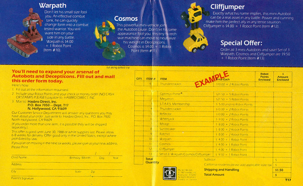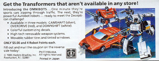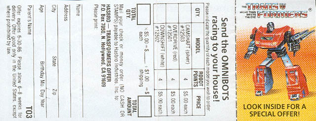 OmnibotsSimilar to the Reflector flyer, this one promotes only the Omnibots: Camshaft, Overdrive, and Downshit. Also with description and order form. Approximate dimensions are 2" by 5" |