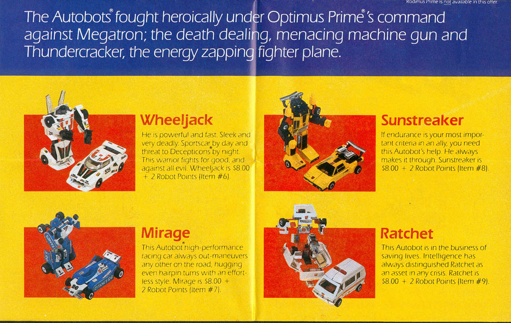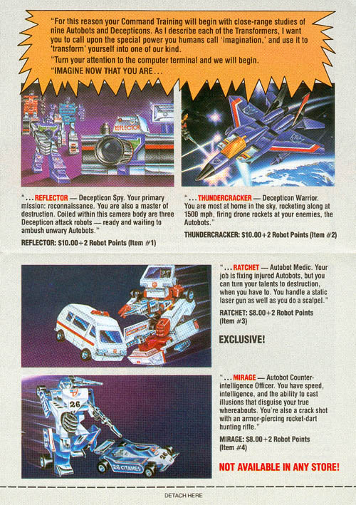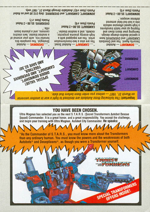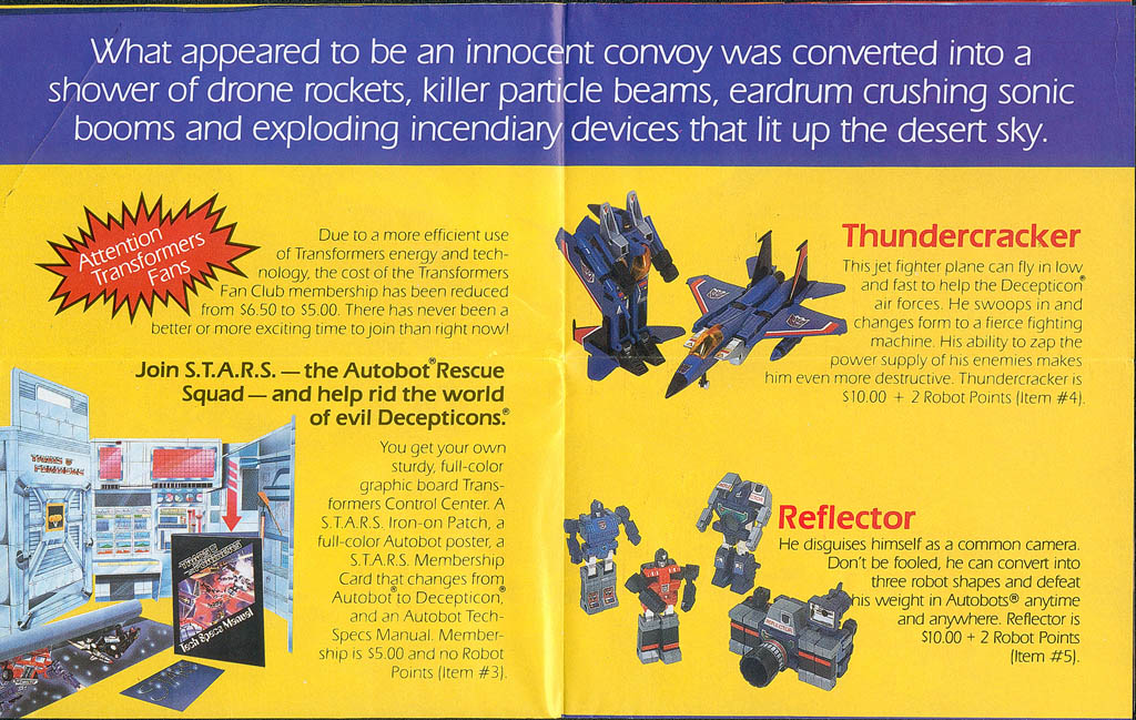 The Quest for Autobot CityThe pages of this flyer aren't really numbered, so I'm just kind of guessing. Approximate dimensions of each page are 11" by 7". This happens to be the promotion that I got my Thundercracker, Reflector, Wheeljack, and Cosmos toys from. I also got Ratchet, which I later traded, and I tried to get Optimus and Megatron, but they were out of stock. |