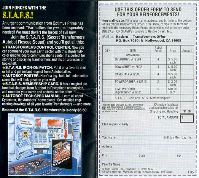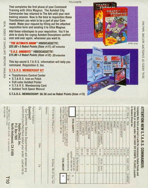 S.T.A.R.S. #1One of the many flyers promoting the S.T.A.R.S. (Secret Transformers Autobot Rescue Squad) TF fan club. The club is basically some TF stuff: STARS iron-on patch, card, poster, tech-sepcs manual, and a "command center" (posterboard thing of some kind). This flyer also sells a "wristlocker" and comes a two-sided flyer... one side in English, one in French. Approximate dimensions are 5-1/2" by 16" when fully opened. |