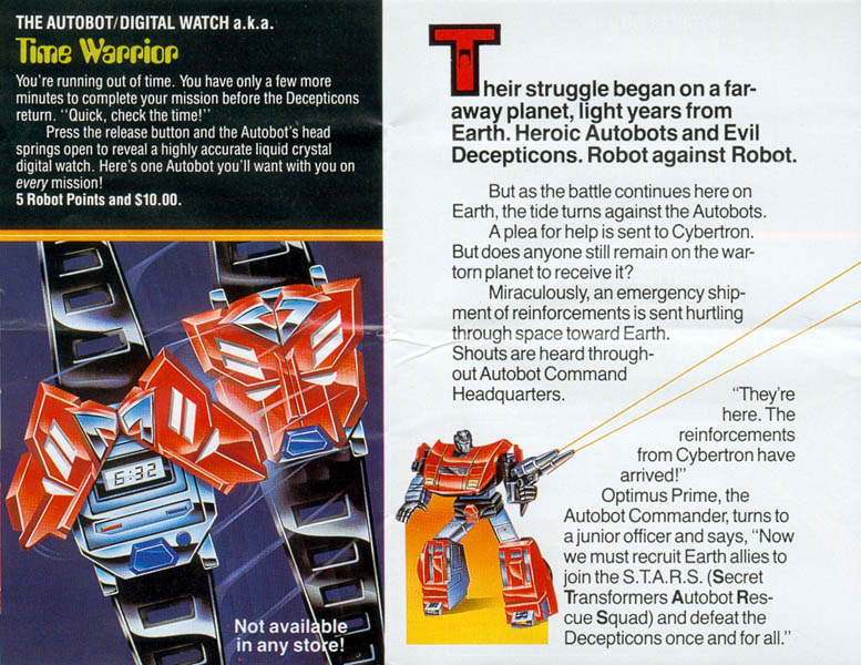 S.T.A.R.S. #4Yet another STARS promo, this one sells the Omnibots, but adding the "Powerdasher" transformers and the "Time Warrior" watch. Approximate dimensions are 5-1/2" by 15" when fully opened.