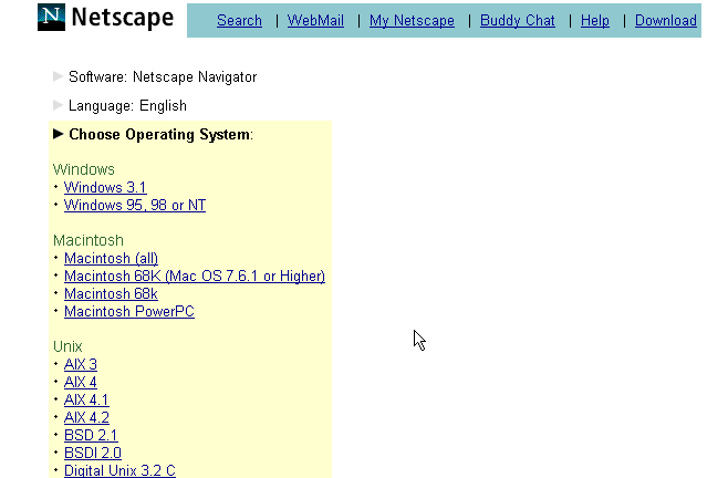 Netscape is accessible from its Downloading Page. From this page, you have to follow a lengthy selection process (language, operating system, etc.). It is impossible to give the complete address because this access path is calculated on the fly and includes the date of the day.