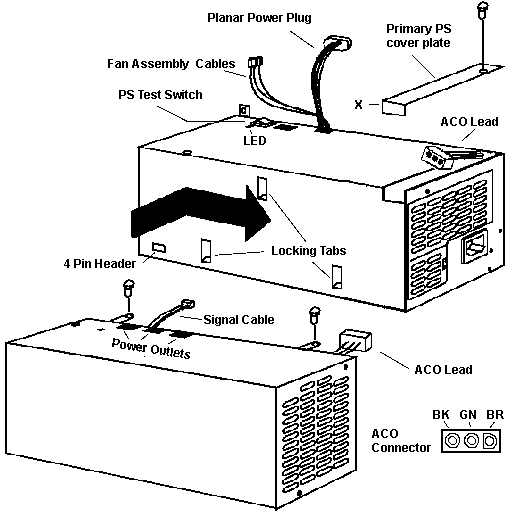 PC Server 500 (8641) Power SuppliesConnecting the Additional PSU (220W) Connect ACO Connector Connect Signal Cable Re-Installing the primary power supply cover plate 220W Power Supply Unmasked! Using 220W PSU as Seperate Power Supply Signal Cable Voltage Source Primary Power Supply Voltages Fan Assembly