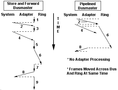 Bus Master/DMA Adapters The TR Network 16/4 Busmaster was the first generation of bus master LAN adapters from IBM. It employed the 64 KB on-board adapter memory as a frame buffer to assemble frames before they were sent to the server or sent from the server to the network. The time elasticity provided by this buffer allowed the token-ring chip set to complete its processing and forwarding of the frame before the frame was lost; known as overrun (receive) or underrun (transmit). The 16-bit MCA bus master was capable of burst mode DMA. It was limited to using only the first 16 MB of system address memory because of it's 24-bit addressing capabilities . Bus master/DMA adapters utilize on-board DMA controllers to transfer data directly between the adapter and system memory without involving the system processor. Bus master/DMA adapters do not use the shared RAM mechanism to transfer data to system memory. However, bus master/DMA adapters do use shared ROM when they are performing the remote initial program load (RIPL) function. Primary advantages of the bus master/DMA adapter: