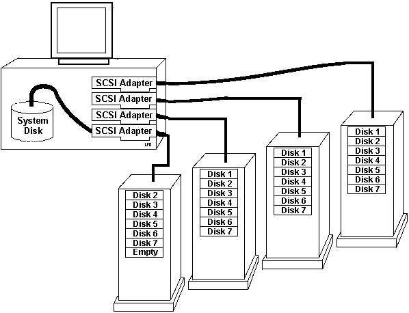 Three of the four 3511 SCSI External Storage Enclosures contain seven SCSI hard drives. The fourth storage enclosure only has six SCSI hard drives because it's SCSI Adapter also supports the System Disk.. This example is for IML systems that require a System disk. A non-IML system could dispense with the system disk and use seven drives in each 3511. Backup Server using
