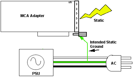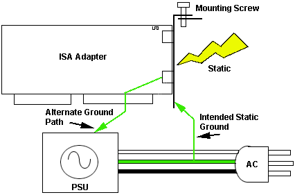 The PC and AT board bracket is designed to be grounded to the chassis ground via the mounting screw. If the mounting screw is loose or missing, then there is no straight path to ground. If the mounting bracket is not electrically isolated, then there are only the 3 pins on the PC Bus, which were intended only to provide a logic reference, to ground the static.
