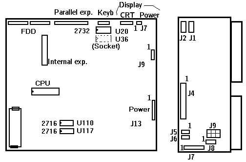 The base unit consists of a powerful switching PSU for computer and printer, mainboard, parallel port interface and a strange component protected with resin (?encoder, Serial ROM?). These parts can be reached by sliding the tray from the rear. Internals look quite robust as in many computers from 1980s.