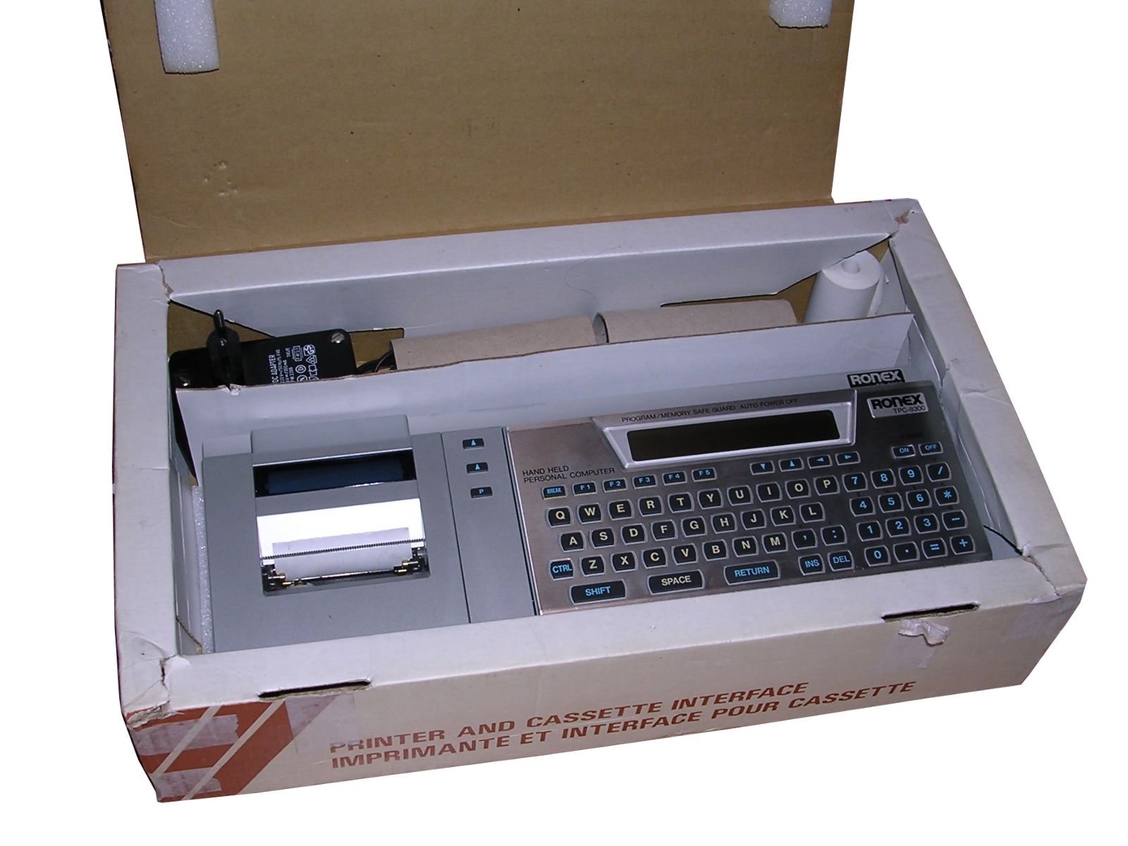 Docking station contains tape and parallel interfaces and a special type of printer which uses revolving head with small ballpens. Head is moving horizontally, while paper can move vertically. Small solenoid presses ballpen to paper giving print-out. Such mechanism can change ballpen colors by shifting head to the left, where it is revolved. In its right side, user may remove small ballpens using special lever. Docking station is powered by power supply or built-in Ni-Cd battery.