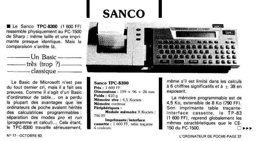Introduced in early 1983 (or late 1982) Sanco TPC-8300 was a pocket-size microcomputer or programmable calculator, which can be programmed in BASIC language. It has built-in LCD (2x 24 characters) and possibility to connect to docking station containing printer and additional interfaces. The computer is built around NEC uPD78C06 8-bit microprocessor and has 16kB of ROM containing BASIC and 2kB (?4KB) of CPU's built-in ROM. All components are in CMOS low-power technology allowing the computer to be powered from AA batteries. It was probably made by Sanyo or Alps.