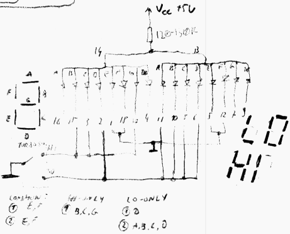 Now how to connect it: Common pins are connected together, then resistor and on its other side GND or +5V, depending on display type, is it common cathode or anode. Other pins have to be connected specific way:. Look at the scanned picture for example in common-anode display.