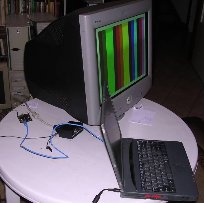 | Monitor, notebook and test picture generator, on the rear, the Arduino Uno board. | Rear of the display showing the drill and connection to Arduino module. |