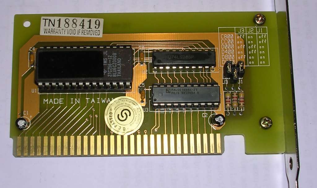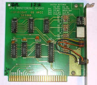 This is a simple thing, a board offers digital I/O into the system bus. This I/O was used probably by some early uninterruptible power supply (UPS) unit to notify the computer that there was a power failure and battery level is low. The software probably then ordered computer to save data and power off. It has 4 DIP switches for configuration, a 6-pin mini-DIN connector probably for UPS and a 3-wire 3.5mm jack.