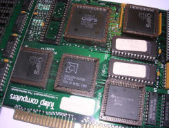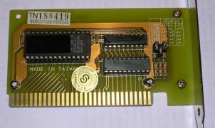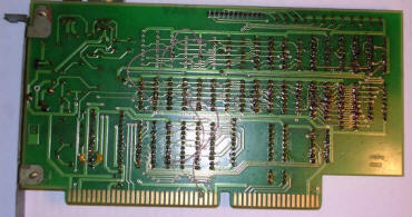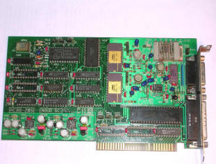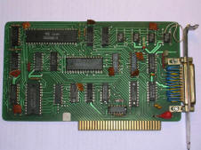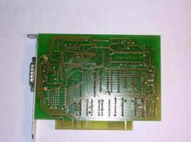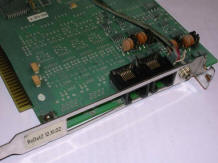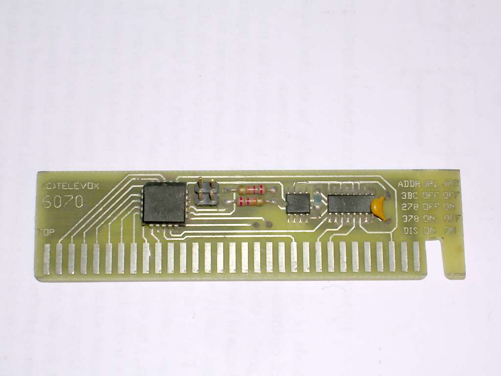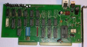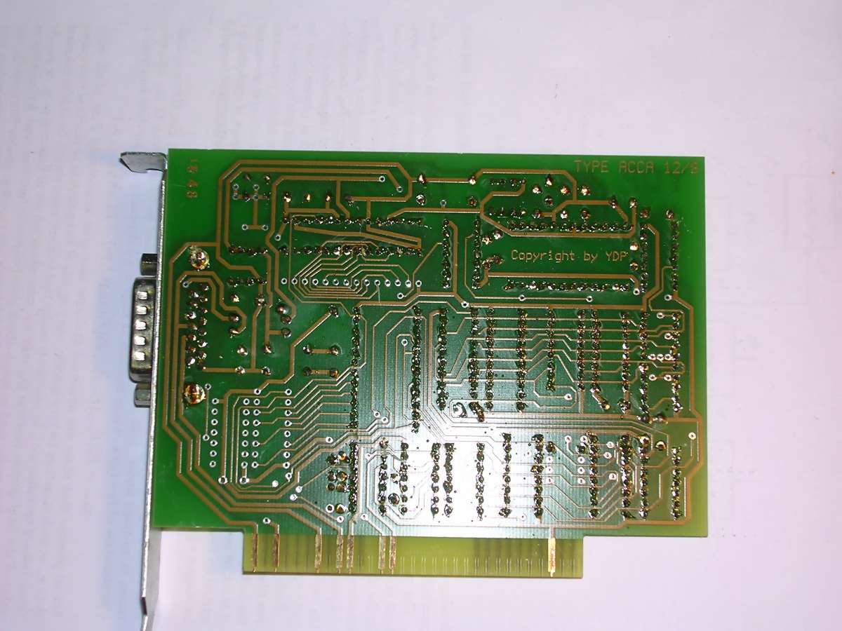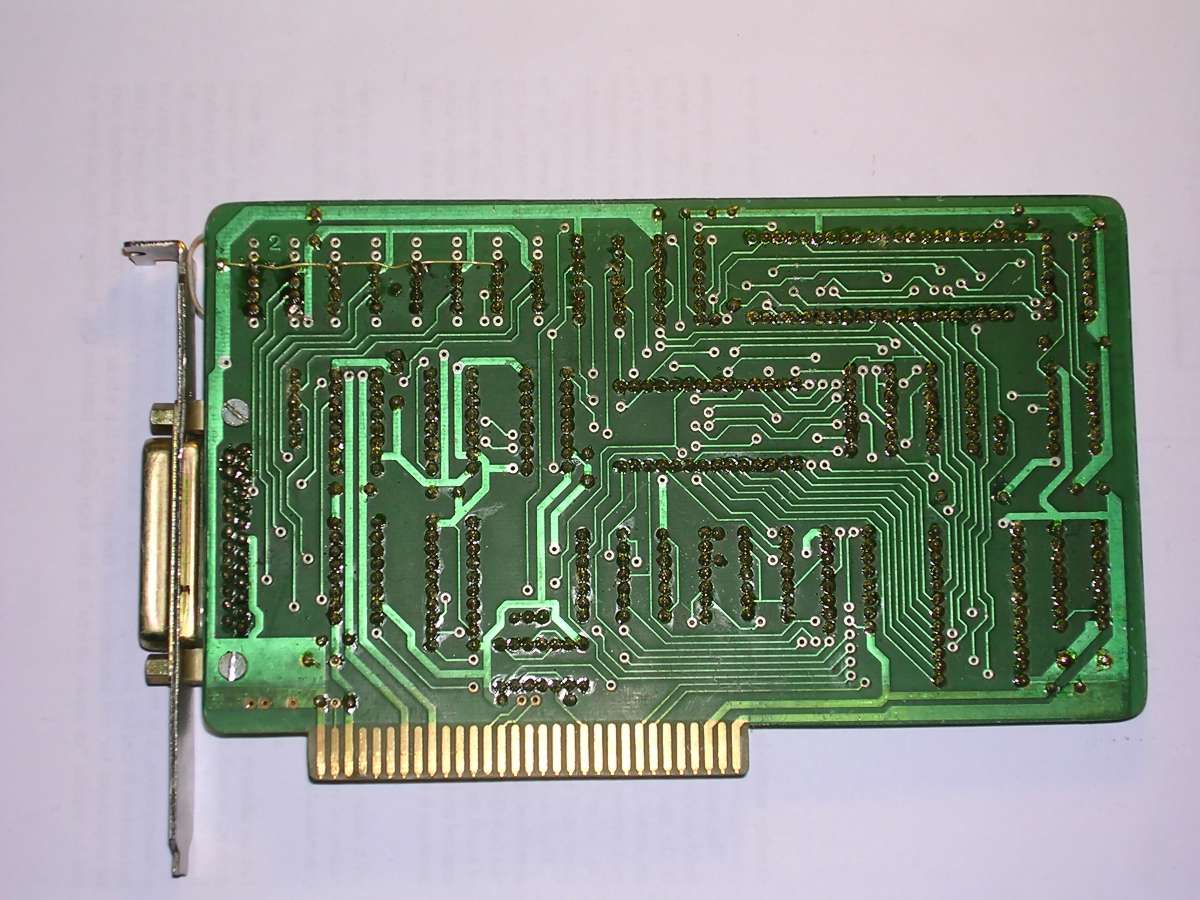 And that's all I know. This 16-bit ISA board has been made by Harpo in mid-1990s. It has TTL logic, jumper block and a complete acoustic amplifier on a bit crudely-mounted heatsink, as well as unpopulated space for 3.5mm-Jack socket. Instead, on the other side of the board, a 2-pin "Goldpin" connector is soldered through resistor, probably to use PC speaker as output. Electrolytic capacitors are used to filter 12 digital inputs driving optocouplers and in their connector there is no ground or power.