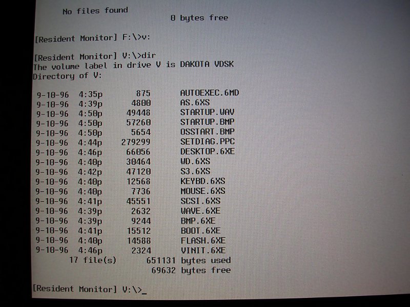 The interesting thing is virtual ROM drive V (dump for research purposes), as it's Dakota Operating System disk, where all BIOS-level programs reside in 6MD (script) or 6XE (code) format. You can run them, but remember to know what you're doing with FLASH and FUPDATE programs, they're for flashing Dakota drive image. As Dakota runs every system boot and Easy Setup is only a GUI of it, modifying Dakota drive may damage your hardware.