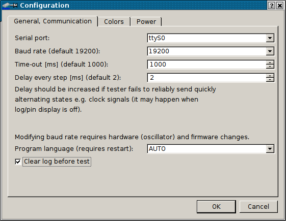 This is quite straightforward. In this window you can change communication port to which tester is connected. And in most cases only this setting has to be changed. Modification of baud rate requires modification of tester itself, so it's safe to leave it at default 19200, change to 57600 if your tester has 57600 jumper installed. Timeout value 1000 is suitable for most computers. If your computer is so fast that during long tests tester "drops" some commands, you can slightly increase Delay every step value, but this should never happen in modern (>2005) hardware and in many cases 0 will work.