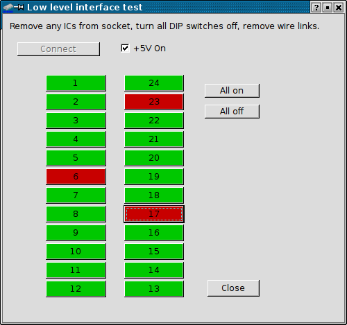 - Error in pin 6 is marked "..." which means that there was an error, but pin 6 is set as ignored (pin is marked with "X-").