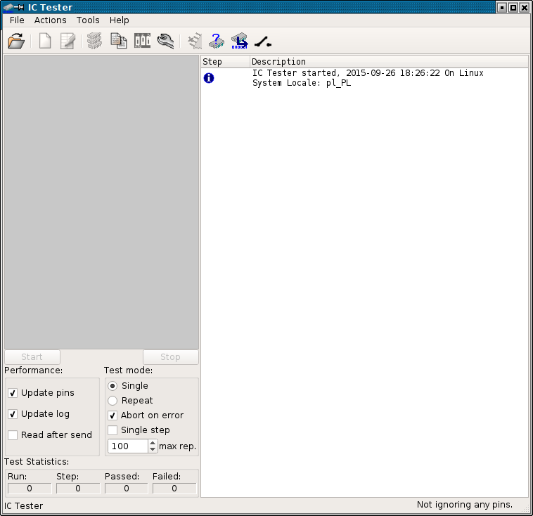 Pin ignoring can be configured from Actions menu or (since version 20150926) from toolbar button. You can program some pins (enter them as comma-separated list after selecting "Ignoring pins") not to be included in test. This is useful if you have bad IC, but you are using only good pins and want to verify that they are good in a full test. Ignored pins list is cleared every IC model loaded or if you leave blank field in "Ignoring pins" window.