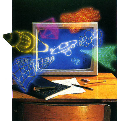 Of course, it's real easy to look at these shapes and say, "Yup, that's how they look;" but what if you were designing an original game? How do you go about coming up with your own shapes? To start with, you should decide how big you want them to be. In making this decision, you should keep in mind how you're going to put the shapes on the screen. For example, anything that moves is either going to be stored in characters or players; in which case you'll have some multiple of eight dots available for width and height (any number up to 256 for player height). So if you end up with a ship that's, say, nine dots wide, you may want to consider shortening it to eight, or taking advantage of the other seven dots if you're going to use two characters or players. Things that won't be moving, such as the barriers in BASIC Invaders, will be drawn with bitmapped graphics; in which case they can be any size you want (as long as they don't overlap into the part of the screen that has character graphics).