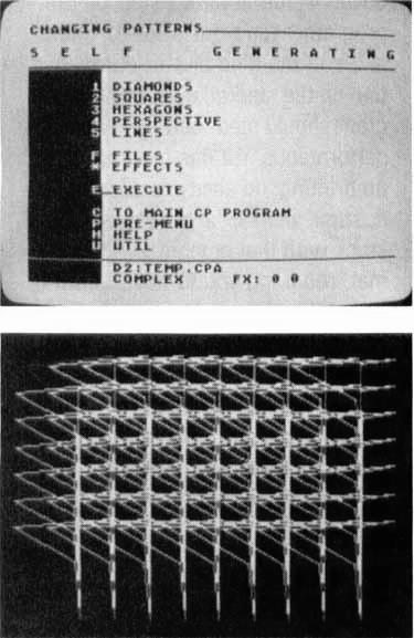 monitor as the designs are drawn.Disk one contains the main program for Changing Patterns, referred to as CP. It also provides a "pre-menu" that serves as a gateway to the other disks, each of which may be booted separately as well. After presenting the title and revision screens, CP delivers the primary Changing Patterns main menu. To get an idea of what this program is about, selecting the self-generating function sends control to the "self-generating" art program, the main creativity module of the CP package. Selecting the Execute option immediately musters an interesting display of diamonds. As they are drawn, console- and keyboard-key presses change the size, shape, colors, margins and numerous other features of the design.