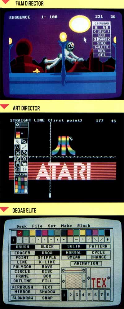 Still another excellent graphics program is Art and Film Director by Epyx. This $80 package includes Art Director, a fullfeatured paint program that uses all the power of the Atari ST to create dazzling works of art. Menus and icons appear onscreen that allow you to choose among a variety of shapes, lines and colors from the palette, as well as perform such actions as stretch, bend, bulge, spin and rescale to enhance the pictures.