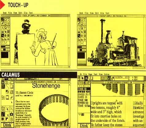 A professional-level desktop-publishing program is Calamus from ISD Marketing. The program provides text and document processing, design tools and page-layout capabilities that rival and often surpass those found in MS-DOS desktop-publishing programs. It uses a full GEM interface with mouse control and drop-down menus, or it can be used with keyboard commands. Vector fonts rather than Postscript-type fonts are used, and the program provides many features, such as outline fonts, printer preview, automatic kerning and stretching.