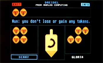 This computer version of Dreidel has many written instructions that advise players of their next move. Several techniques have been employed to provide other kinds of cues for nonreaders, making the game accessible to younger children as well.