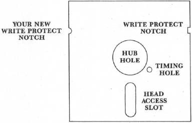 If you follow these instructions carefully, a good 90% of major brand mini-floppies can be turned into "flipped" floppies. Place two disks in front of you face up on a very clean surface. Once again you are cautioned not to touch the recording surface through the head access slot. Take one of the disks and place it flipped over on top of the other, such that the head access slots are at the bottom. Align them both exactly and, with a light colored pencil, make a mark on the bottom disk along the inside edge of the flipped floppy's write protect notch. With a standard hole puncher, punch a half hole (i.e. no further into the jacket than your pencil mark) completely through both sides of the jacket at your pencil mark. This half hole is now the write protect notch for the flip side. The fact that this hole is round is of no consequence, since the only thing of importance is that the mechanical switch inside your drive can drop into a notch of some type.