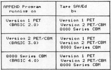 Back when there was only one operating system (set of ROMs) for the PET, the APPEND routine was much simpler. The second version (BASIC 3.0) made several changes which increased the challenge in designing an APPEND program to run on either version and APPEND a tape which had been created on either version. Appearance of BASIC 4.0 in the 8000 series complicated matters further. There are now nine possible combinations, as depicted in Figure 3.