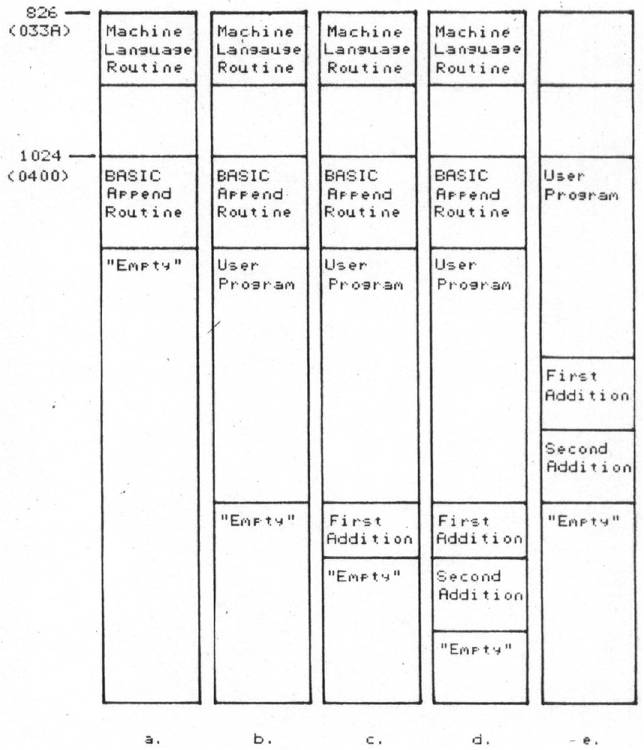 Then remove the APPEND tape from the cassette unit, insert a tape on which another program has been stored, and enter RUN. After the cassette unit stops and the computer reports READY, you should be able to enter LIST and see the append program followed by the one you just added to it.