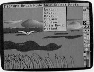 Pull-down menus control file handling and screen format: custom brush options like flip, rotate, and bend: and effects such as smear, blend, and smooth, Special features include perspective, a complex, keyboard-driven system for tilting any brush or screen to create the illusion of spatial depth, and stenciling, for masking selected colors or areas so they can't be painted over. There's also a spare screen for thumbnail sketches and support for superbitmap pictures up to 1008 × 1024 pixels in size.
