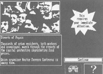 Some of your best help will come from a specially designed desk. Instead of paperweights and address books, your desk is equipped with icons representing different aspects of the game. Under the Reports icon, you'll find several national and international newspapers. I found the articles really valuable because they kept me in touch with events I might have otherwise unknowingly neglected. If you read the newspapers as soon as you get in office, you'll be rewarded with a detailed synopsis on the slate of the country, and you can use the information to make intelligent decisions. Remember that each press has its own point of view and its own interest to serve. A newspaper can be as biased as a union activist.