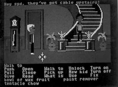 Maniac Mansion is an animated adventure. You move a character around the screen, grabbing things, examining them and so on. Following ICOM's lead, the Lucasfilm interface has 14 verbs in a menu below the picture. By clicking on these actions in concert with items in the picture, you Pick Up. Open, and Use things. The New Kid command permits you to hop from one character to the next.