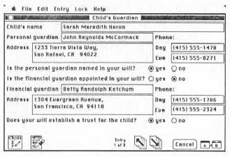 At the heart of For the Record is the program's preprogrammed database. You use this database to record and track information in 27 major categories, ranging from Business Interests to— I'm not kidding here— Death Plans. For the Record further divides each major category into 1-18 subcategories. Category 24, Personal Information, for example, includes subcategories for Employment History, Military Record, Past Residence and Marriage, among others. In a true tip of the hat to our modern culture, there's even a subcategory called Significant Relationship, in which you can record important dates and other items relating lo a nonmarital, live-in liaison.