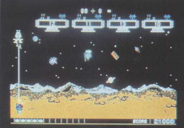 In another of the four games, Math Blaster, Blasternaut has to fly up to the ship bearing the correct answer to the math problem displayed. To arrive safely, he'll need your help dodging the space trash circling the planet. Take too long maneuvering him around, and the Trash Aliens will descend to the planet's surface. Move too quickly, and you risk having Blasternaut hit by a flying brick. As in any good arcade game, you can gain additional lives, provided you correctly solve several problems in a row. Watch out, though; he'll lose those extra lives in short order if you don't learn how to maneuver him quickly. Every piece of trash he collides with slows him down and costs him a life. At higher levels, the speed at which the Trash Aliens descend increases, and there's more and more space trash to deal with. Just knowing the right answer isn't quite enough. Getting Blasternaut through the space trash unharmed before time runs out is harder than it seems.