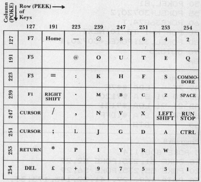 What this means for us is that, even after we have just chosen a row by POKEing a value into the select register, the RUN STOP routine will change it right back to a 247. Very bad news indeed, unless you only want to use row 247. Not only that, but you can't use the RUN STOP key for your own purposes. There is a way to disable the RUN STOP key. POKEing 808 with 114 turns off the RUN STOP key, and POKEing 808 with 112 turns it back on again. This does not solve our problem. Turning off the RUN STOP key will prevent it from ending program execution when that key is hit, but the routine still stores that 247 in the select register. However, when we clear up the major problem, turning off the RUN STOP key will allow us to use that key in our programs.