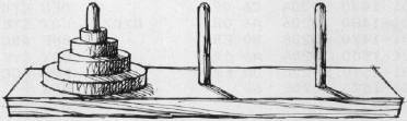 This interesting mathematical problem is often found disguised as a child's toy: a board with three pegs and four or five disks of varying diameters that fit on the pegs. The disks are initially arranged on the first peg in order of their diameters, with the smallest one on top. They are to be moved one at a time, always keeping the smaller ones on top, until they are on the third peg.