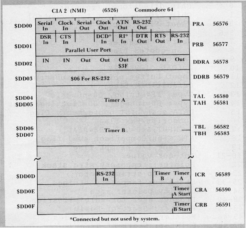 DD00-DD0F	56576-56591	Interface chip 2, NMI (6526 CIA)