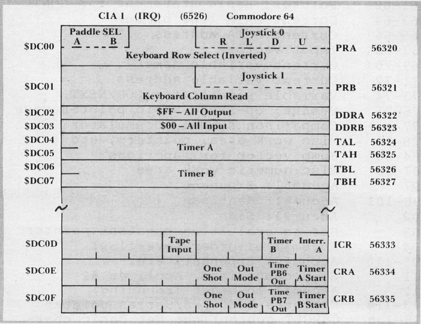 DC00-DC0F	56320-56335	Interface chip 1, IRQ (6526 CIA)