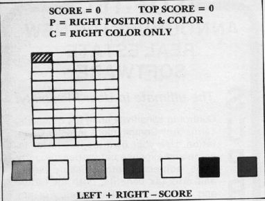 The computer will score a guess in two ways, which are described at the top of the screen. Under the P-score, the computer will tell how many of the colors in the user's guess are correct colors in the right positions. The C-score will tell how many other colors are correct, but in the wrong positions. When the two scores add up to four, the user will have identified all of the colors in the hidden pattern. If the P-score is exactly four, then their positions are correct as well, and the game ends. Each time a P-score occurs, a whistle sound will be heard as an audible reward.