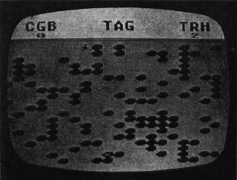 Plug a joystick into jacks one and two, and get ready for some furious chasing and dodging. After the game initializes, each player can type in his initials three letters). You then select the final score (what play to) from 1-10. Press OPTION to increase the final score, and SELECT when the desired number appears. The game will begin with player one in the upper left-hand corner, and player two in the opposite corner. Player one will be flashing, which indicates that he is It.