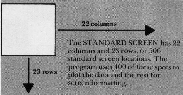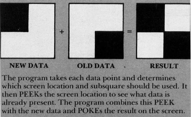 We can display a medium resolution graph on the VIC by dividing each standard screen location into four equal subsquares. In this way, the 400 positions used in the program have the potential to represent 1,600 separate data points. The price that is paid to achieve the higher resolution is that data is no longer simply POKEd on the screen. The program first has to PEEK the screen location and combine it with the new data point to be displayed. This new combination is then POKEd back on the screen (see Figure 1).