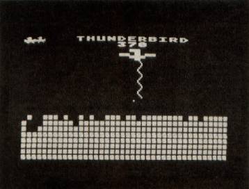 "Thunderbird" will demand your undivided attention and all of the memory the unexpanded VIC-20 has to offer. The object of Thunderbird is to score as high as possible. The high score will be kept from game to game. The scoring is as follows: 200 points for taking out a tree, 50 points for taking out a saucer, 75 points for deflecting off either wing of the Thunderbird, 25 points for deflecting off the main body of the Thunderbird, and 1000 points for breaking out the bottom of the playing field. When the satellite drops into a well, 125 points are subtracted from the score.