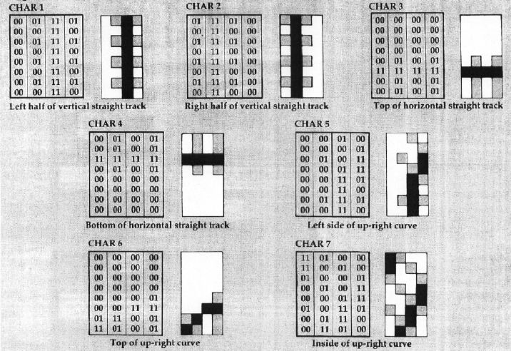 The easiest way to create the train layout is to use an alternate character set with a multicolor character mode, if your computer will allow it, though direct pixel manipulation will also work. On the Atari, for instance, you would probably use ANTIC mode 4, which provides a screen 24 characters high and 40 characters wide (just like Graphics 0). You might then divide the screen into four-character by four-character blocks, giving you a grid of six blocks vertically by ten blocks horizontally. (Any arrangement that comes out even will do.) Obviously, these blocks correspond to the "square" track units.
