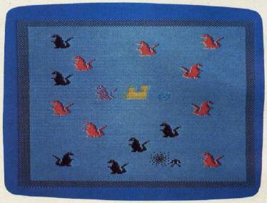 The dragons are the main obstacle in your chivalrous adventure. To eliminate a dragon, you have to move directly in front of his stomach and press the fire button. The dragon will disappear. The phantom dragon guarding the gates must be dispatched last. You will find that the dragons do move about and change color now and then, but this is only restlessness. In addition, a dragon will occasionally appear from nowhere to test your mettle.
