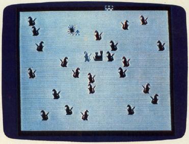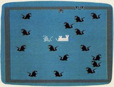 The knights quickly discover the many dangers of the hunt. A dragon will eat anyone who comes near its head. The only way to get rid of one is to zap it in the stomach. Guarding the castle is a phantom dragon that can only be eliminated when all the others have been overcome. (The castle drawbridge will remain closed until he is conquered.) At times a dragon will appear from nowhere, and occasionally a dragon you thought you'd disposed of will reappear to have another try at the knight. And last, but certainly not the easiest of the perils, is the evil wizard himself, who chases the knights as they hunt the dragons. If the wizard catches a knight, the knight is destroyed.